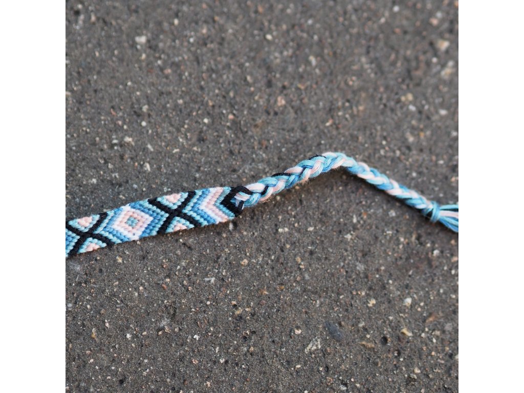 Tento náramek je dlouhý 17 cm (bez copánků na zavázání) a je ručně pletený z bavlnek Mouline.